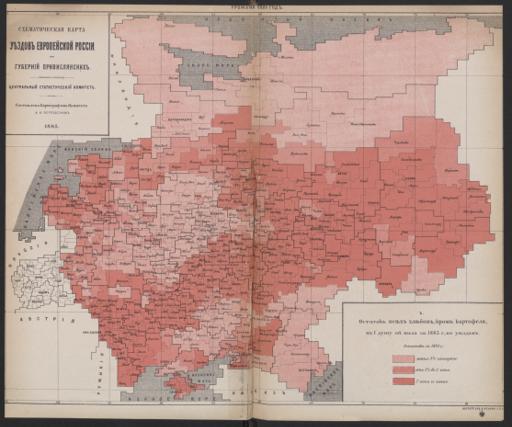 Schematičeskaja karta uězdov evropejskoj Rossīi. Ostatok vsěch chlěbov , kromě kartofelja