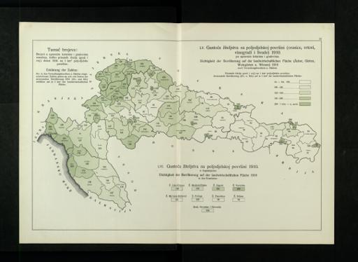 Gustoća žiteljstva na poljodjelskog površini (oranici, vrtovi, vinogradi I livade) 1910. po upravnim kotarima i gradovima