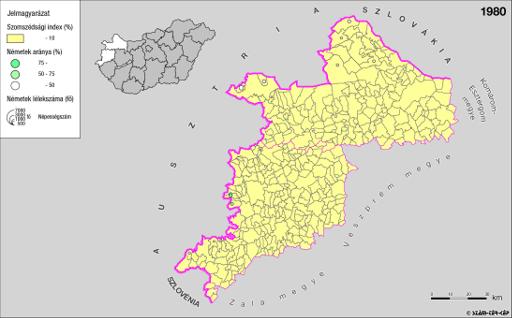 A németek településterülete a szomszédsági mutató alapján Nyugat-Magyarországon 1980-ban