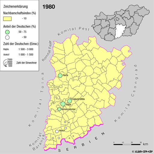 Siedlungsgebiet der Deutschen nach dem Nachbarschaftsindex für das Komitat Bács-Kiskun 1980