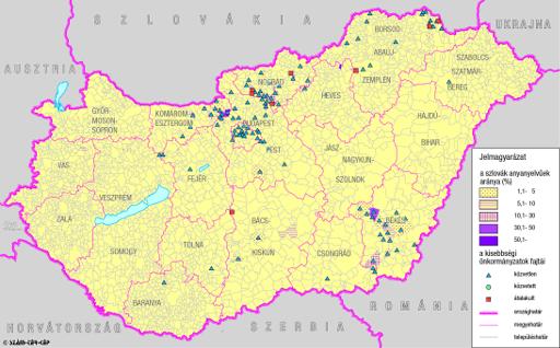 A szlovákok száma és aránya Magyarország területén (2001) és kisebbségi önkormányzataik (2004)