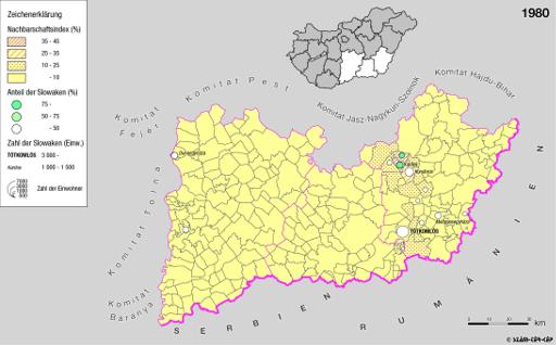 Siedlungsgebiet der Slowaken nach dem Nachbarschaftsindex für die Südliche Tiefebene 1980