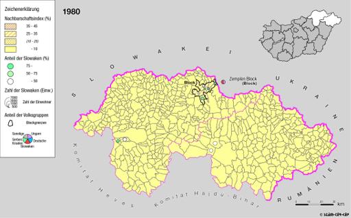 Siedlungsgebiet der Slowaken nach dem Nachbarschaftsindex für Nordost-Ungarn 1980