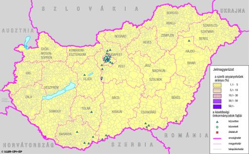 A szerbek száma és aránya Magyarország területén (2001) és kisebbségi önkormányzataik (2004)