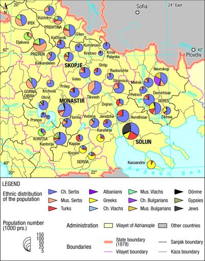 Map 28 : Ethnographic distribution of the population in Saloniki Vilayet (Gopčević, 1889)