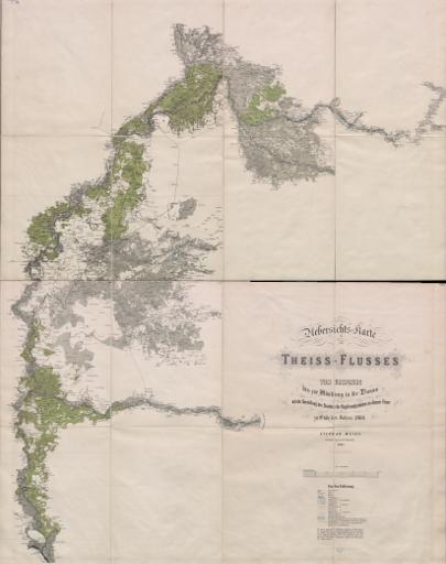 Uebersichts-Karte des Theiss-Flusses : vom Ursprung bis zur Mündung in die Donau mit der Darstellung des Standes Regulirungsarbeiten an diesem Flusse zu Ende des Jahres 1860