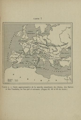 Carte approximative de la marche simultanée des Alains, des Suèves et des Vandales, en l’an 406 et suivants