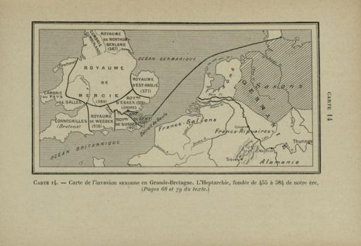 Carte de l’invasion saxonne en Grande-Bretagne. L’Heptarchie, fondée de 455 à 584 de notre ère