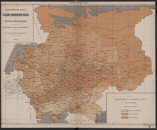 Schematičeskaja karta uězdov evropejskoj Rossīi. Urožaja rži s desjatiny za 1885 g.