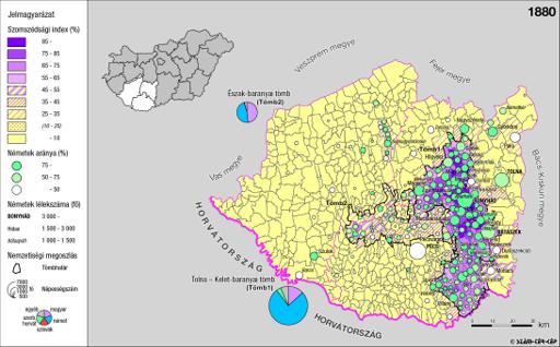 A németek településterülete a szomszédsági mutató alapján Dél-Dunántúlon 1880-ban