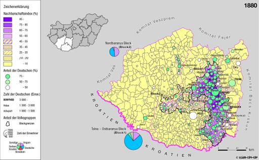 Siedlungsgebiet der Deutschen nach dem Nachbarschaftsindex für Süd-Transdanubien 1880