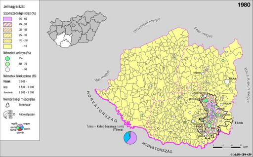 A németek településterülete a szomszédsági mutató alapján Dél-Dunántúlon 1980-ban