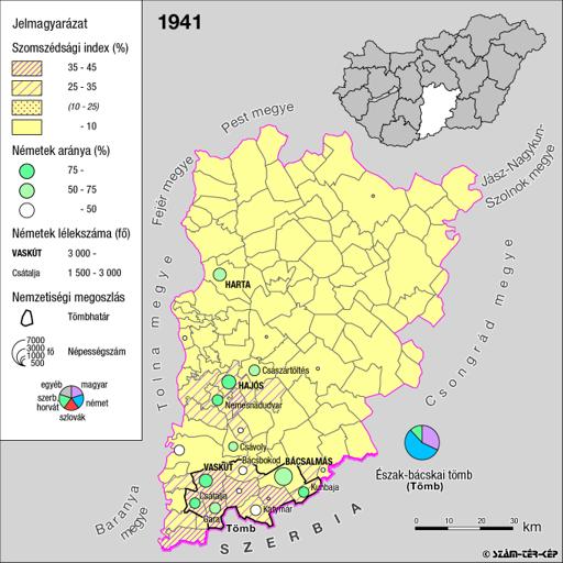 A németek településterülete a szomszédsági mutató alapján Bács-Kiskun megyében 1941-ban