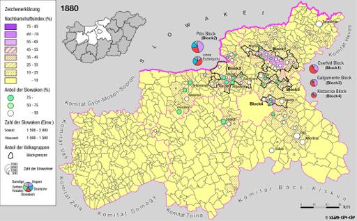 Siedlungsgebiet der Slowaken nach dem Nachbarschaftsindex für Mittel-Transdanubien 1880