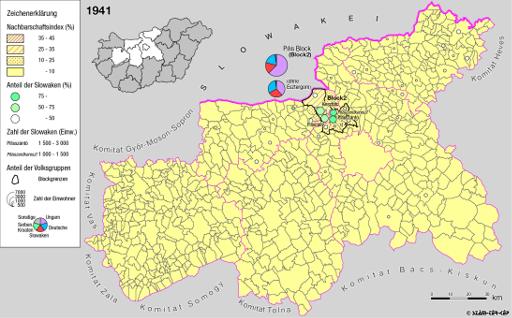 Siedlungsgebiet der Slowaken nach dem Nachbarschaftsindex für Mittel-Transdanubien 1941