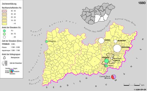 Siedlungsgebiet der Slowaken nach dem Nachbarschaftsindex für die Südliche Tiefebene 1880
