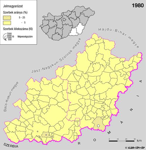 A szerbek aránya és száma a Dél-Alföldön 1980-ban