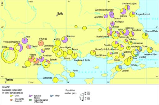 Map 38 : Language distribution of the Christian population in Macedonia and Thrace (Syllogos and the Greek Patriarchate, 1878)