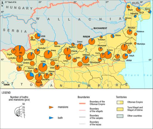 Map 42 : Inns (han) and baths (hamam) in the towns of Tuna Vilayet, 1876