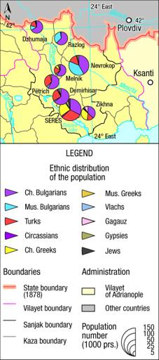 Map 48 : Ethnic distribution of the population in Seres Sanjak, cca. 1894 (Kănchov)